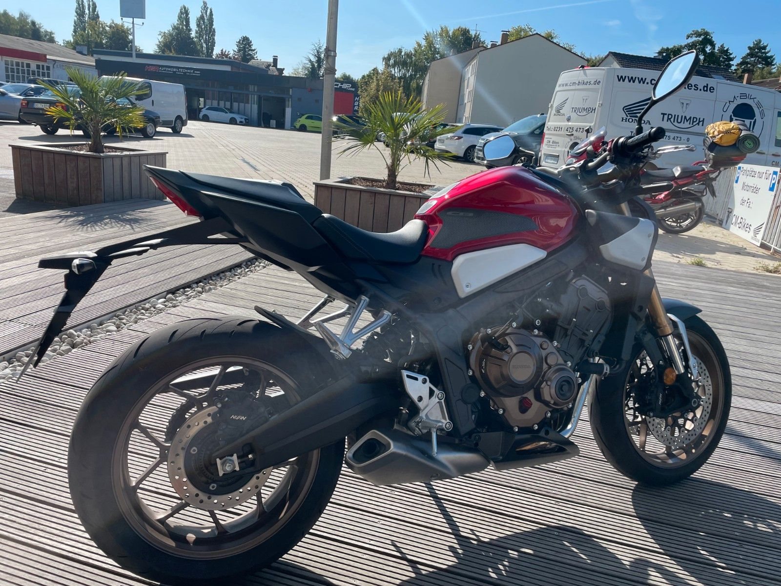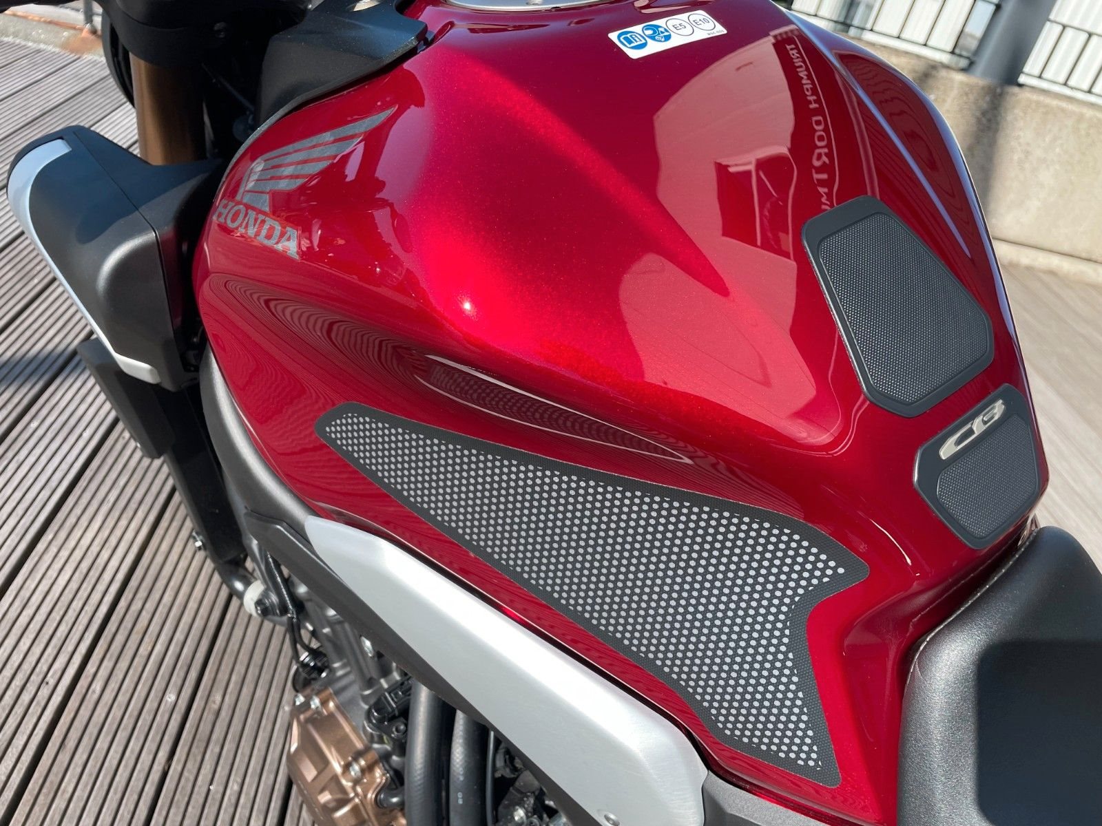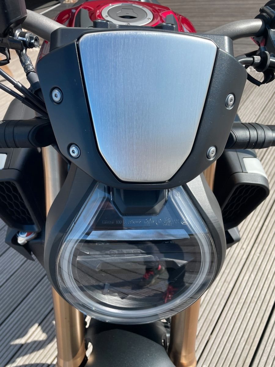 Sportliche Linienführung Dank Trapezform und der kompakten, aggressiv hoch angesetzten Sitzverkleidung. Neuer markanter LED-Scheinwerfer Wie bei der CB1000R mit Aluminiumblende und markanter LED-Lichtsignatur.
