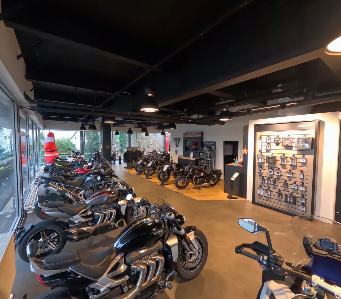 Auf ca. 1.500 qm Ausstellungsraum mit Fachwerkstatt bieten wir ihnen die komplette Modellpalette von Triumph und Honda Neufahrzeugen, sowie immer eine Auswahl an gebrauchten Fahrzeugen aller Marken. Des weiteren stellen wir einen Großteil des Original Triumph und Honda Bekleidungssortiment aus und bieten diverse Accessoires für viele Modelle in der Ausstellung.